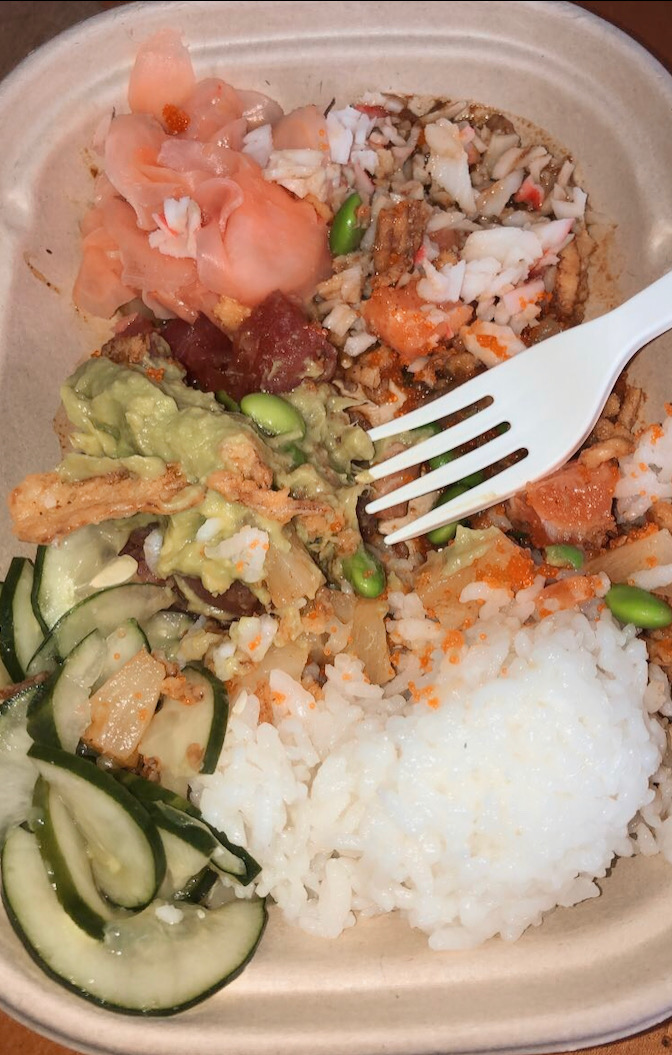Typically I get white rice, ahi tuna, salmon, seaweed salad, crab, pineapple, edamame, and a few other fixings. I love how light and fresh the food is — it fills me up without making me feel heavy or bloated.